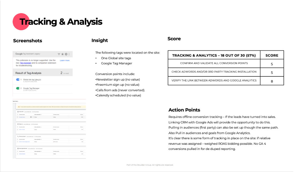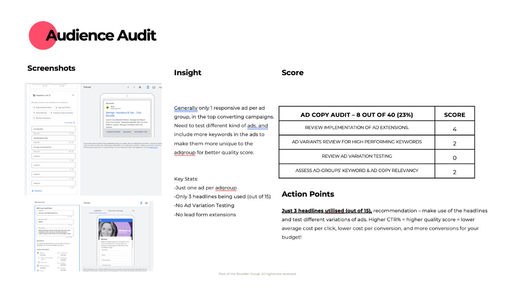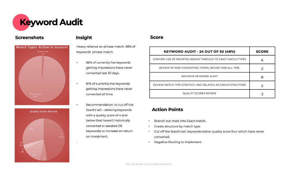 We will provide you a scorecard of your whole paid search account you can see in fine detail where the opportunities are to improve performance.